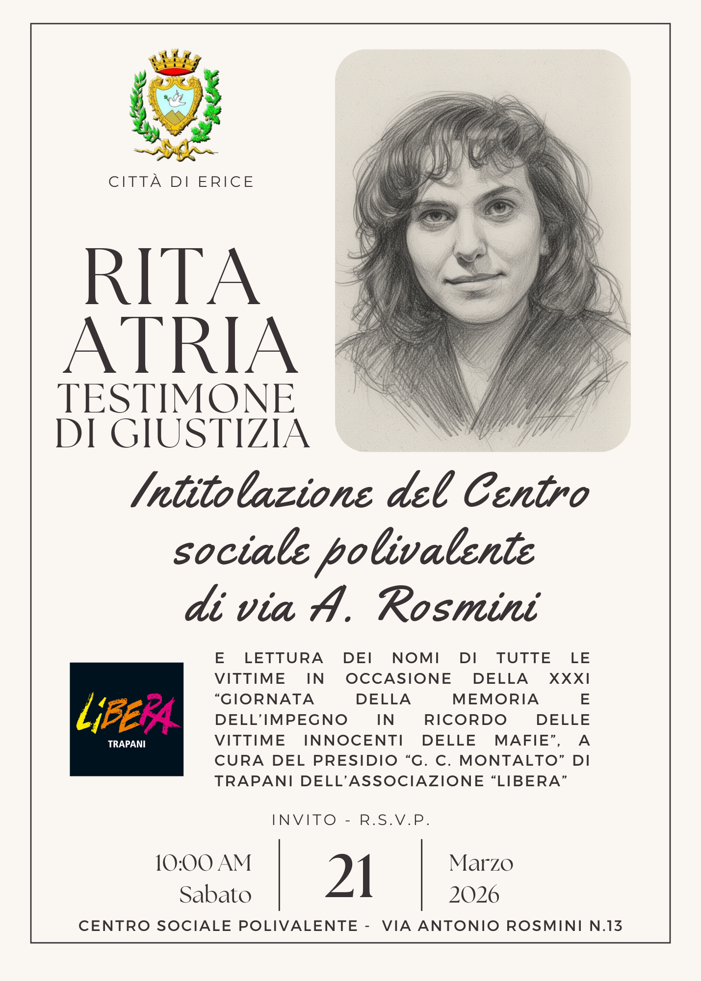 L’Amministrazione comunale informa la cittadinanza che il Centro Sociale Polivalente, sito in via Antonio Rosmini n. 13, sarà ufficialmente intitolato alla memoria di Rita Atria, giovane testimone di giustizia che con la sua scelta di ribellarsi alla mafia ha rappresentato un esempio di coraggio civile e di responsabilità personale. L’appuntamento è fissato per sabato 21 marzo 2026, a partire dalle ore 10.00.