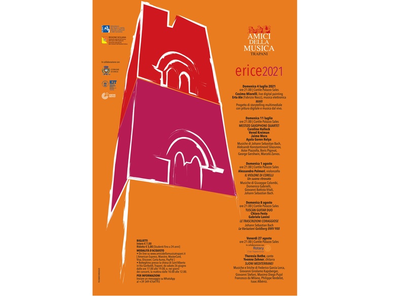 Con 5 straordinari concerti, caratterizzati da un'offerta musicale poliedrica, per concezione, varietà dei programmi e degli ensemble musicali, ritornano i concerti della rassegna estiva degli Amici della Musica di Trapani. Per il secondo anno i concerti verranno ospitati nel cortile del Palazzo Sales, ad Erice. La rassegna si inserisce all’interno del cartellone Ericestate 2021 organizzato dal Comune di Erice.