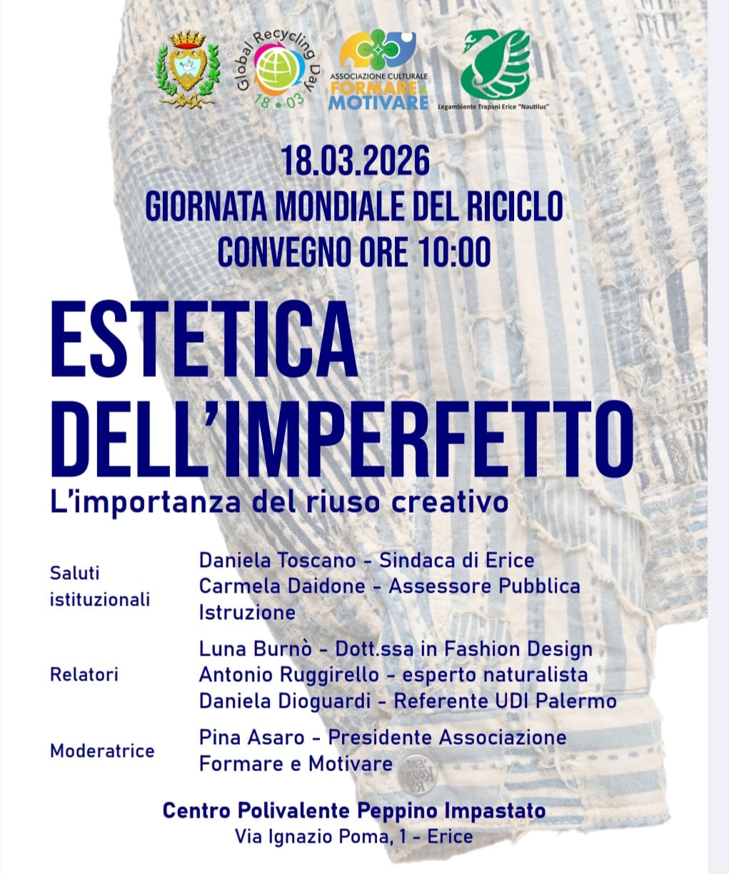 Un’occasione di riflessione e sensibilizzazione sui temi della sostenibilità ambientale e della riduzione dei rifiuti. È questo l’obiettivo del convegno dal titolo “Estetica dell’Imperfetto. L’importanza del riuso creativo”, promosso dall’Amministrazione comunale in occasione della “Giornata mondiale del riciclo” e in programma mercoledì 18 marzo 2026, alle ore 10.00, presso il Centro Polivalente “Peppino Impastato”, a Casa Santa (via Ignazio Poma n.2).